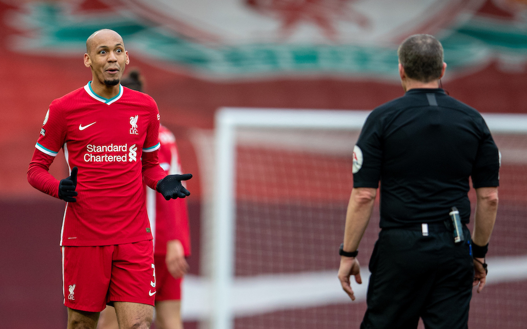 Liverpool's Fabio Henrique Tavares 'Fabinho' speaks with referee Kevin Friend during the FA Premier League match between Liverpool FC and Fulham FC at Anfield. Fulham won 1-0 extending Liverpool's run to six consecutive home defeats.
